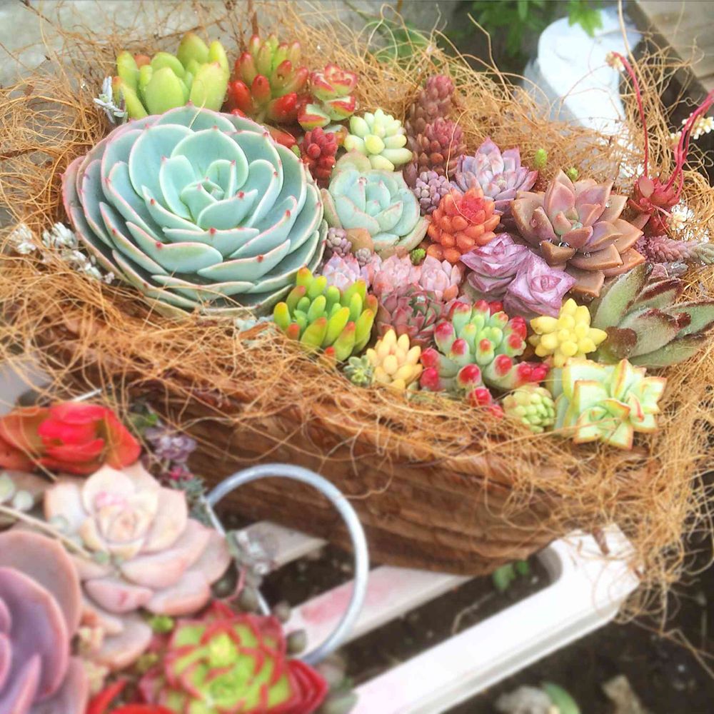 人気のある出品者さんのカット苗セットを運良くゲットできたので、カゴとココヤシで寄せ植え♡