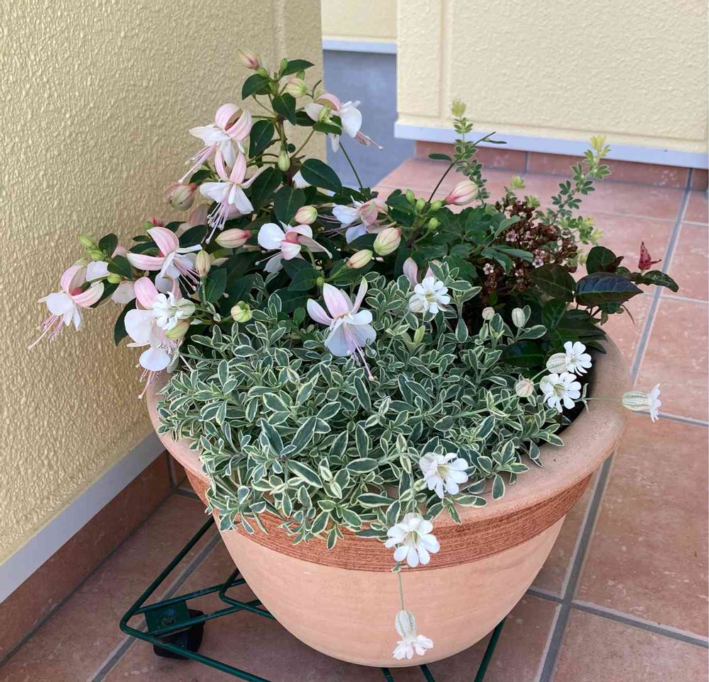 寄せ植え、バックの風鈴八重オダマキの花が途切れてフクシアさんがもう少し背が高く咲いてくれたら嬉しいのですが😅