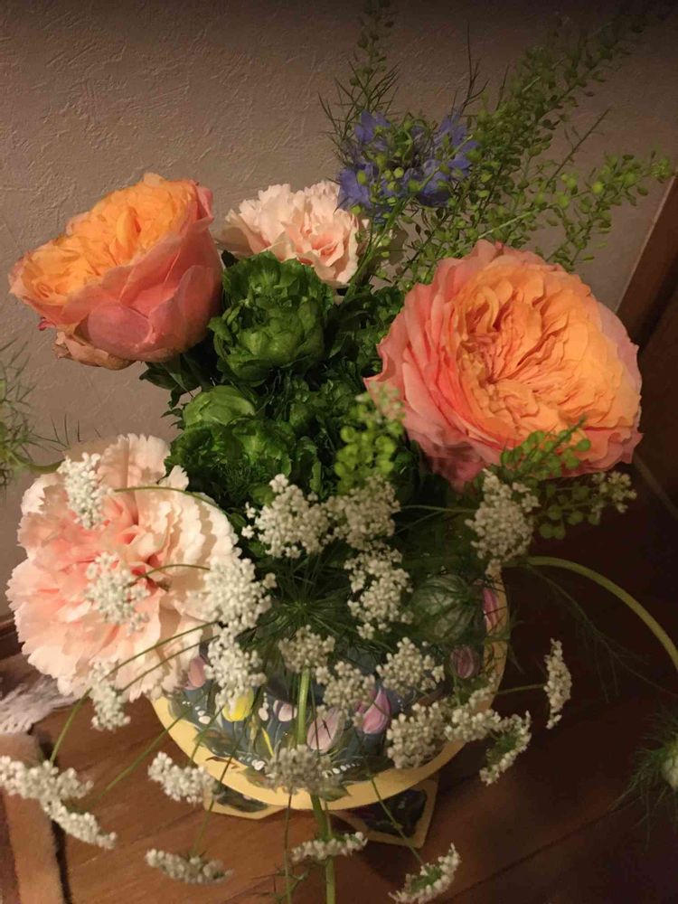 次女がプレゼントしてくれたオレンジのバラとカーネーションのアレンジ💕