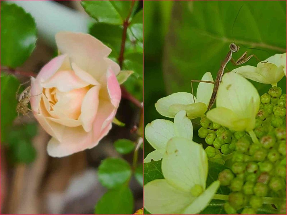 ホントだわ❣️薔薇も紫陽花もお花が透明感があってすごく可愛いけどクモ?とカマキリ?が子供のカマキリ…可愛いワ( *´艸`)