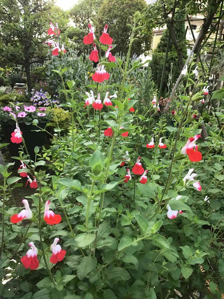 以前は 赤 一色の チェリーセージを 持っていましたが、長年 栽培していると、すごく木質化してしまって、最後には 勢いも 無くなって しまい、哀れな 株に なってしまいました‼︎‼︎ その年、ご近所さんが このタイプの 赤に