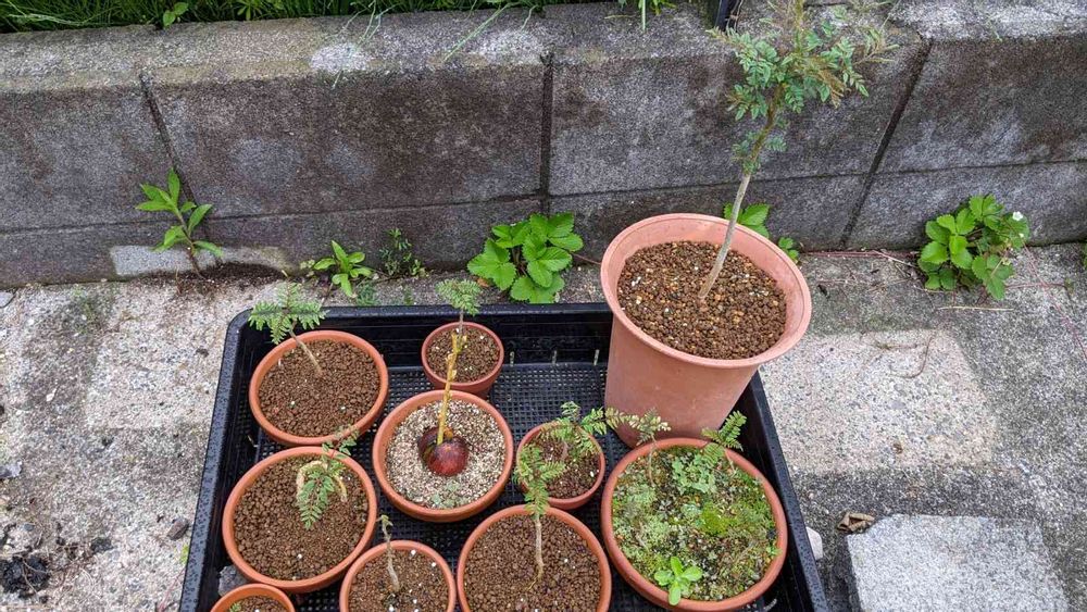 我が家のジャカランダゾーン。一番小さいのは去年の挿し木がついたもの。(写真には切れていて写って無い)旦那が去年盆栽用に買ったものまで入っているので数えたら10本以上でした。一本だけ猫に葉を落とされたアボカドが混じってます