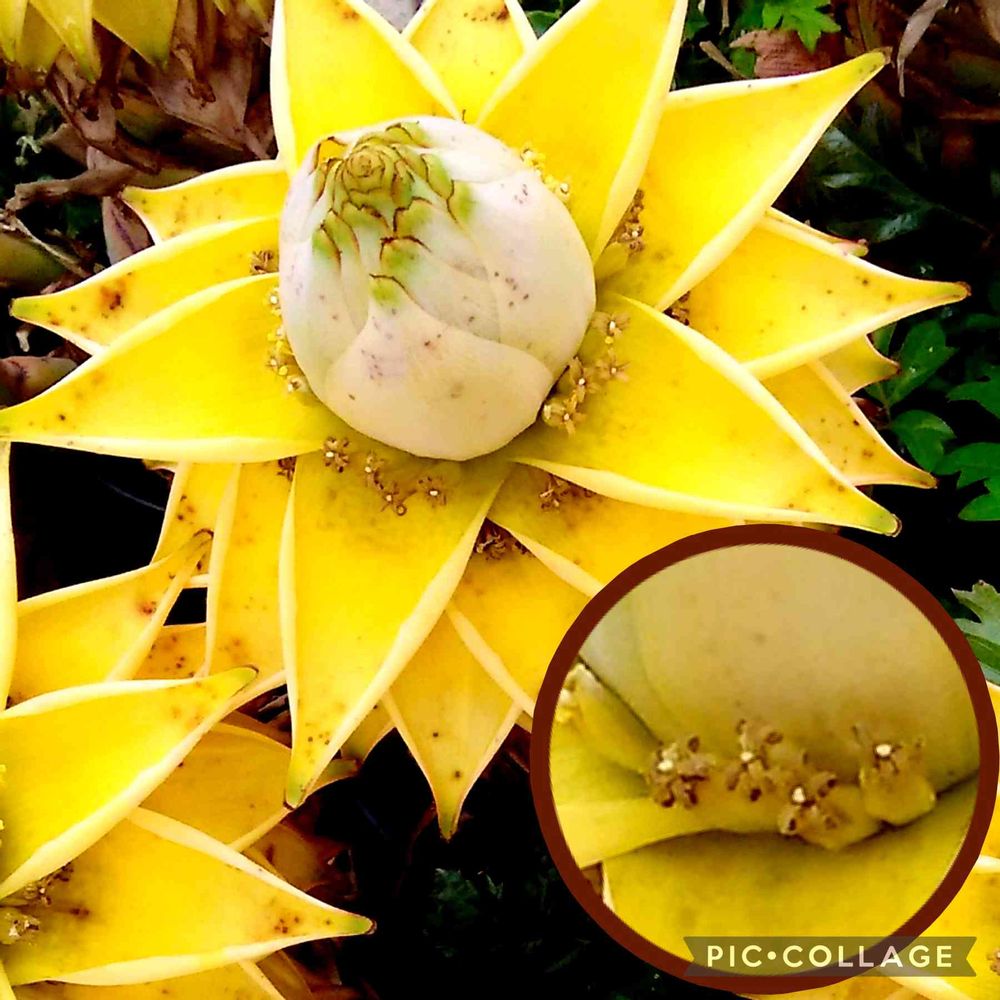【茎の高さは60~80㎝、茎の頂部で花びらのように四方に開いている部分は苞で、直径30㎝ほどになります。苞の付け根に見えるたくさんの小さな筒状の器官が1つ1つの独立した花です。それらの花が終ると次の苞が開き、次の花が出てきて開花します】
