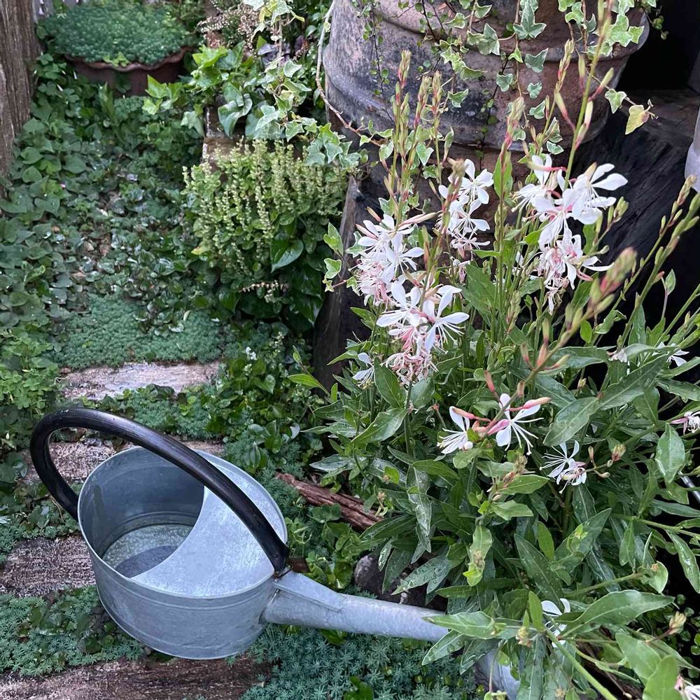 地植えにしたガウラさんが 狭い場所で広がり過ぎるので、茎をテグスで1周巻いて 更に下部に支柱を3本で支えて 広がりを抑えました😅伸び伸び育てられなくてゴメンよ〜ᐪᐤᐪ