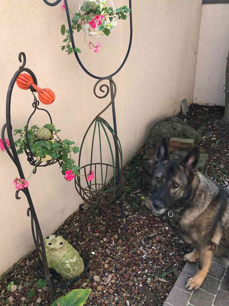 うちのシェパードと、アイビーゼラです。 なかなかポーズしてくれないので、大好きなおもちゃをひっかけています(笑)