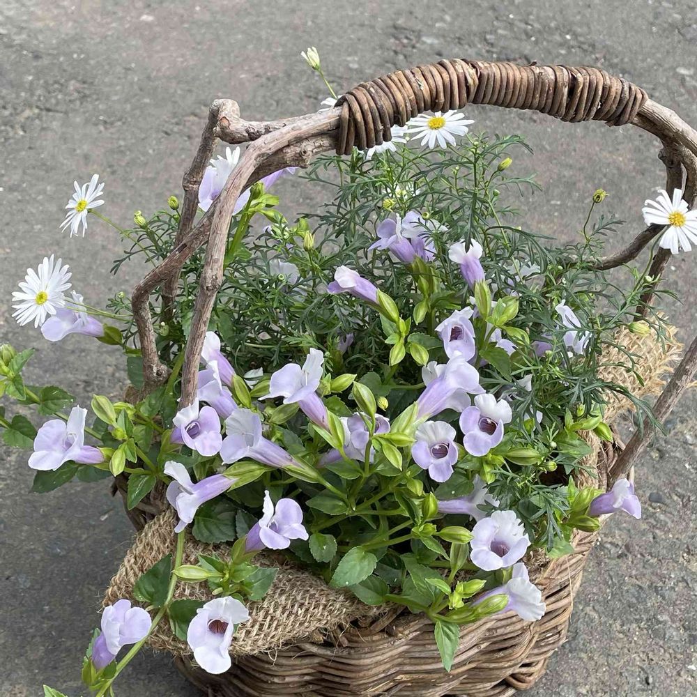 少し前、ナチュラルなバスケットに植えるのがマイブーム(死語?)になり、職場と家でいくつか寄せ植えを作りました。これもそのひとつで、家用です。