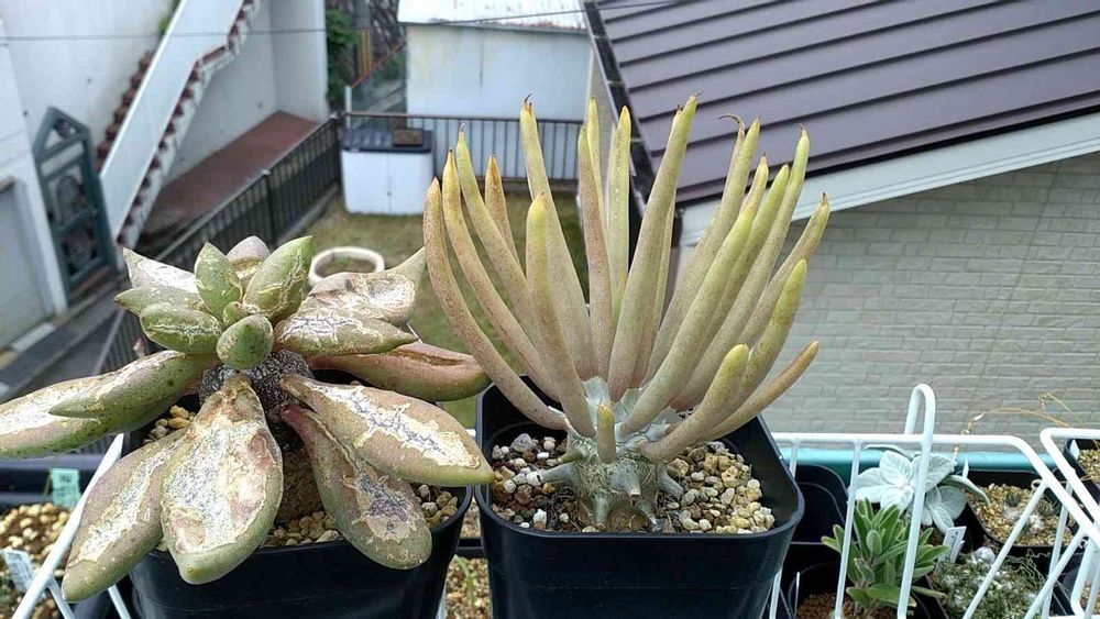 ついでに棒ではないけどチレコドンレティキュラーツス(左)毎年冬が終わる頃になると葉っぱが割れてくる🤔🤔なんでなんだろう?