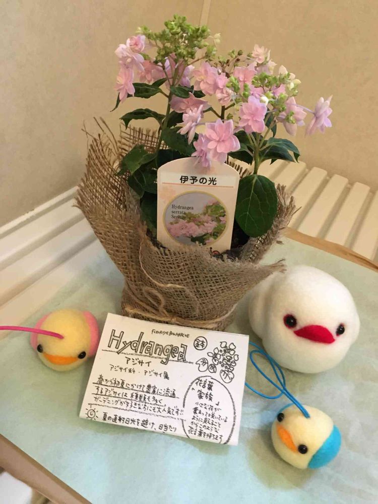 昨日、娘が買って来てくれたヤマアジサイ、伊予の光。カーネーションの代わりにお母さんが好きそうな花🌸があったからとくれました。花言葉は家族。鳥さんの家族を置いて見ました。小さくて八重咲きで、優しいピンク色。私は大喜びです。ありがとうー😊❗️