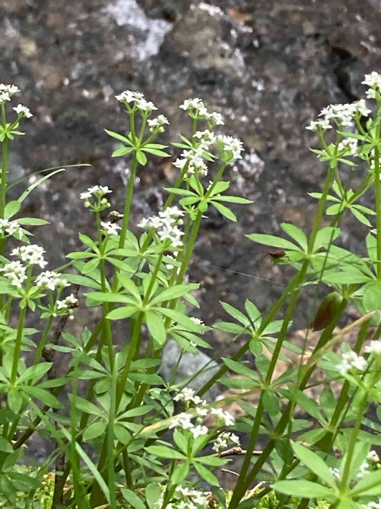 クルマムグラです。クルマは車輪状に輪生している葉っぱのことで、ムグラは草むらという意味だそうです。クルマバソウという似た花があって迷いましたが、花径が1センチとありました。これは半分ぐらいしかないので多分クルマムグラです。