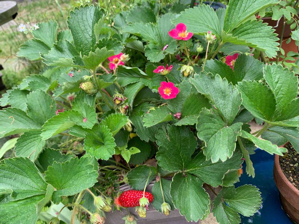 最近全く手入れしてない花見用苺がいつの間にか花が咲いて実を付けていました、大きな実は美味しそうですが物凄く酸っぱくて食べられません。