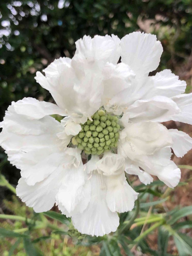 植木鉢に可愛く収まるサイズのスカビオサが多いですが、これはお花の大きさが約10cm,背丈約50cmになる大きなお花です。タグにはブルーと書いてあったので、それを花壇に植えましたが、咲いてみたら素敵なホワイト✨で、嬉しい誤算でした😳❣️