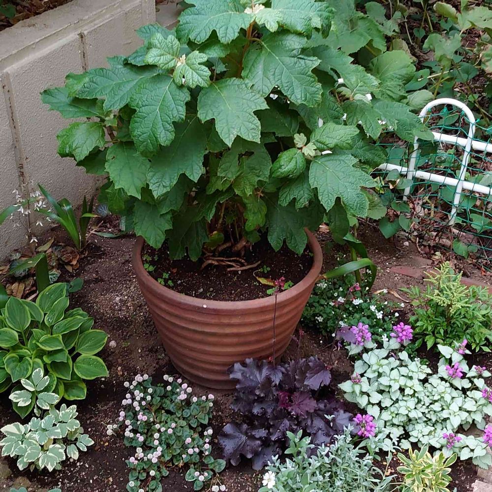 カシワバアジサイの周りは、蕗の群生地でした😆そこに、とりあえず日陰に強そうな植物植えてみました。どうなるか全くわからないガーデニング初心者です🤣カシワバアジサイは、冬に強剪定して植え替えたので花芽は無いです(T_T)