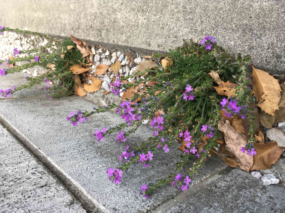 ブロック塀とコンクリートの三和土?との10センチほどの隙間(砂利)に咲いてます。南向きで夏は過酷な環境です。数年前に目にしてから毎年この時期に紫色の花が咲きます。