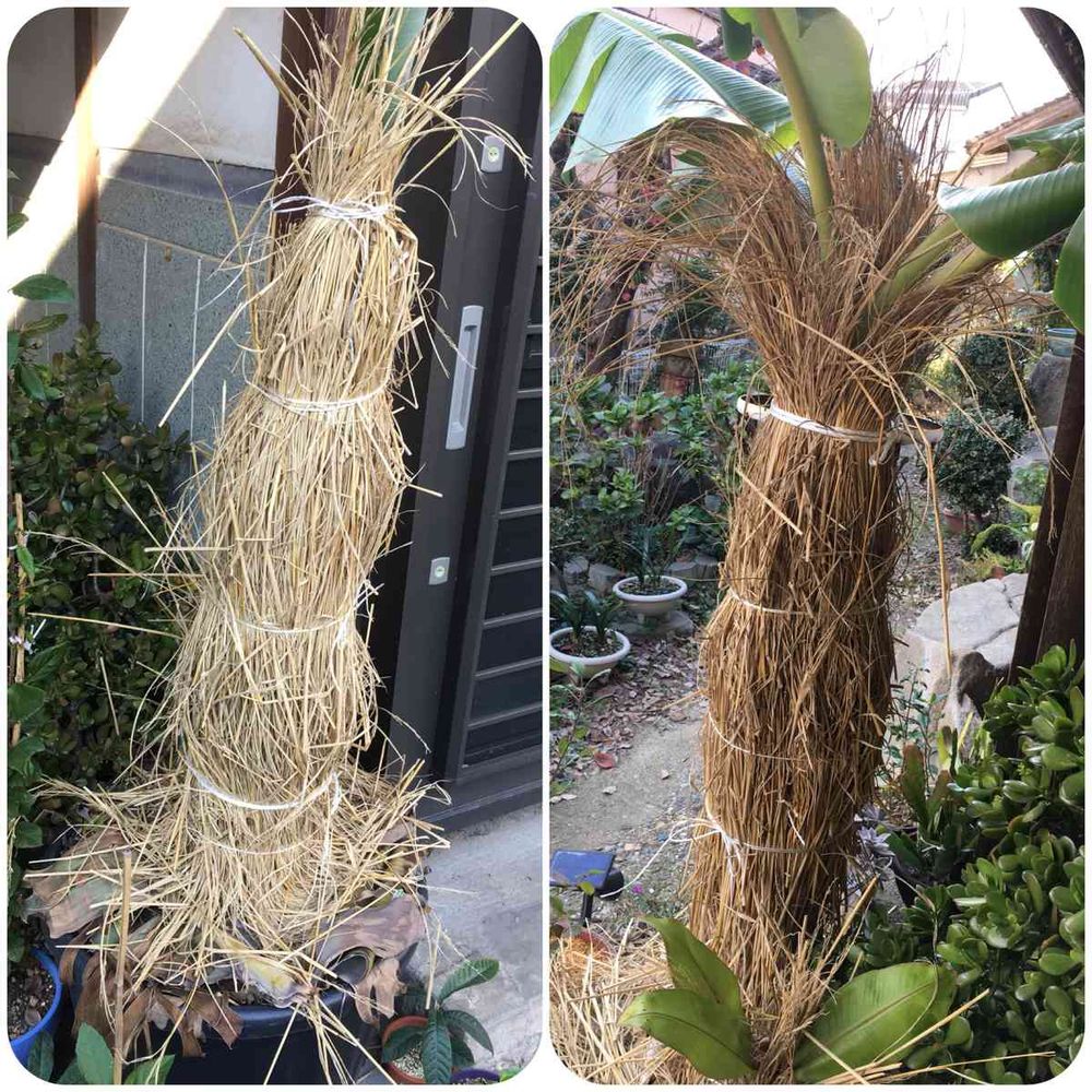 アイスクリームバナナを購入した奥飛騨ファームさんのブログを参考にグリーンテープでぐるぐるからの藁で巻き巻き根元には切り落としたバナナの葉を。