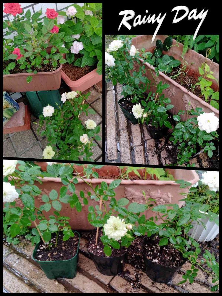 雨で退屈なので、玄関の鉢を入れ替えてミニバラの株分けをしました。株分けすると私はどうせずぶ濡れになるので、お花には申し訳ないけどお付き合い頂きました。