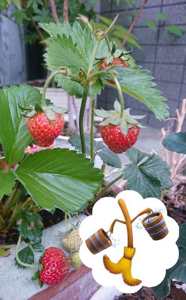 🍓イチゴが、立ち上がった枝の上の方にぶら下がっていて、ファンタジア(Disney)のホウキに見えて仕方ない🤩