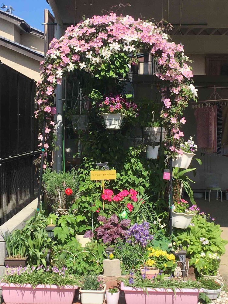 クレマチスがようやくアーチ型に見事咲いてくれました。🤍💗🎶🥰