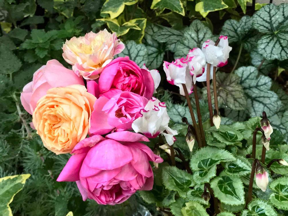 きれいなグリーンをバックにデルバールの🌹さんたちとシクラメンが華やかにコラボして、うっとり~香りも~💕