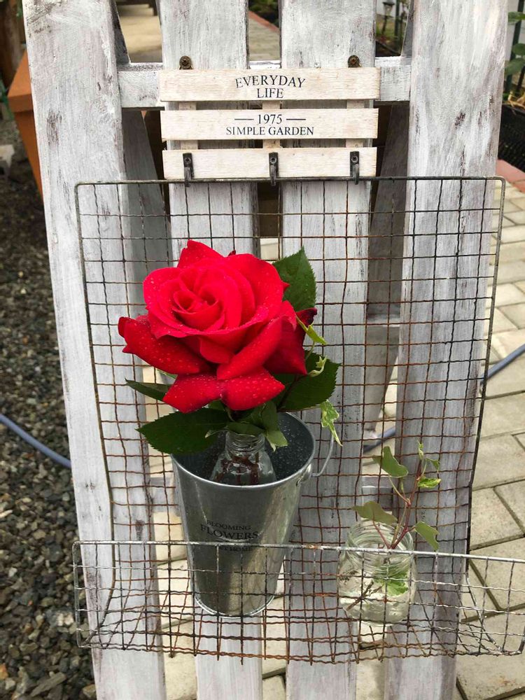 ブリキバケツに入れた小びんにアイビーと共に挿してみました♡