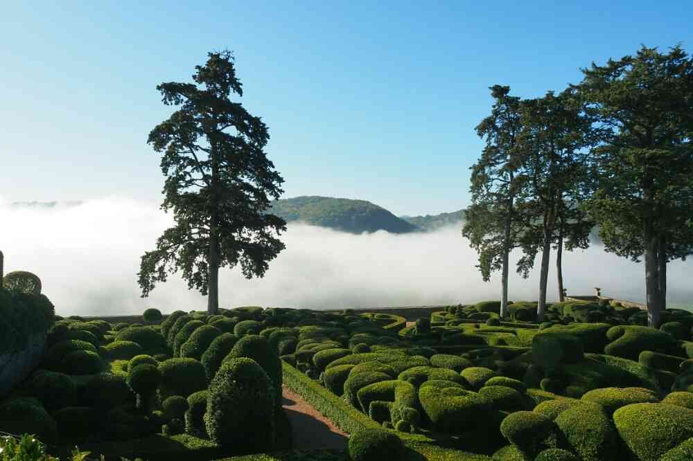 不規則に不思議な形に刈り込まれた木々の向こうには