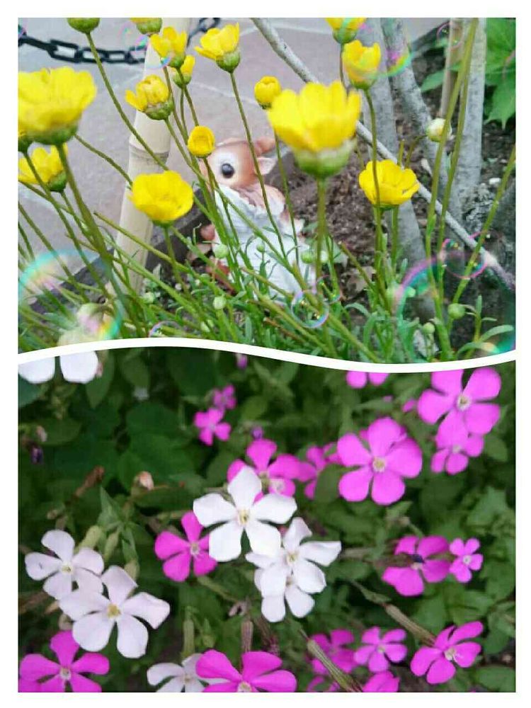 お向かいさんちの玄関前にはこの春から記念樹みたいないろんな樹木と草花が、今賑やかに咲いてます。