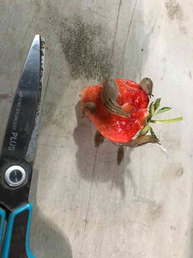 毎日、5,6個収穫するのを楽しみにしているのですが、あーらビックリ⁉️一番美味しそうな一個に大小のナメクジが推定5匹もたかっていました。