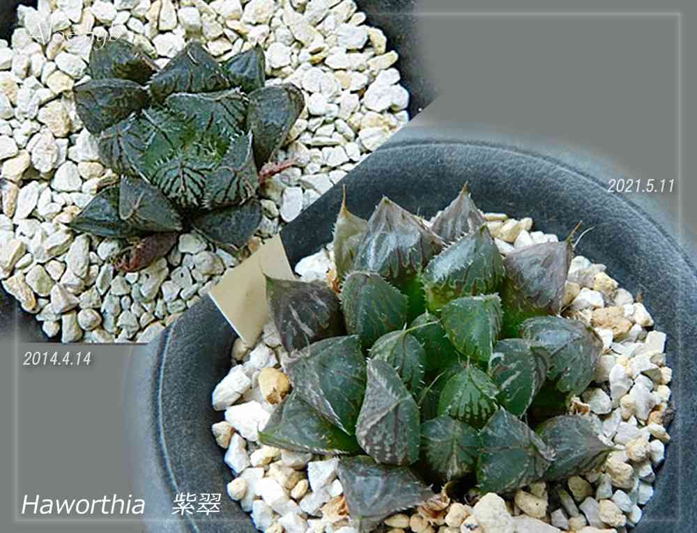紫翠の札がついているけど、検索しても似たのがヒットしない謎ハオルチア。こいつも、全然成長しないんだよなーと比べてみたら、一応成長してたみたい。ほかのハオルチアに比べて株が平面的で、水が足りなくなると土に潜りそうになる。