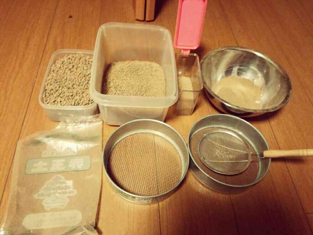私の場合、鉢が小さいので、三種類のふるいにかけて、粒を三つにします。小粒4ミリ程度、細小粒2ミリ程度、超細小粒1ミリ以下。微塵は廃棄です。