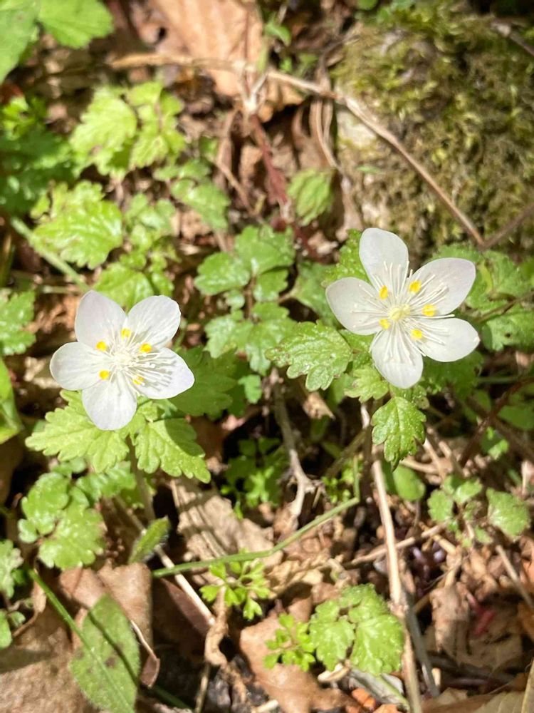 イチリンソウやニリンソウにしてはあまりに小さいので調べてみると、ツルシロカネソウという花でした。高さ10センチ、花径は2センチぐらいでした。とても繊細な花です。