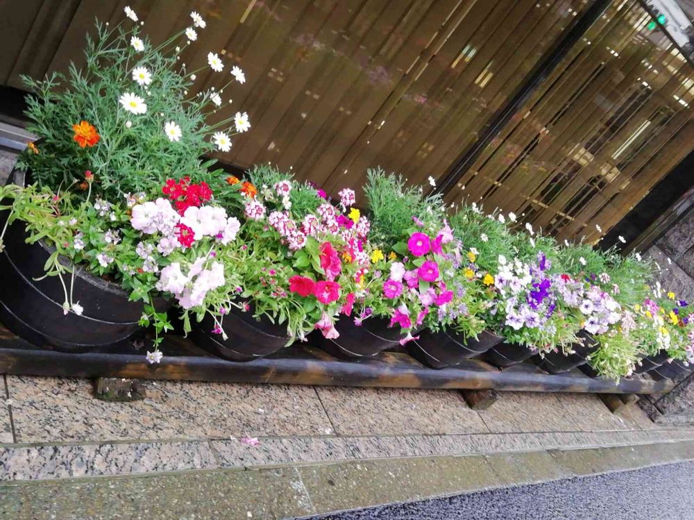 とある有名食品メーカーの歩道沿い。寄せ植えがずらっと、この4倍ありました。一つ一つは、きれいなんだけれど、こんなにたくさん寄せ植えしすぎると、ごちゃごちゃしていて、残念。