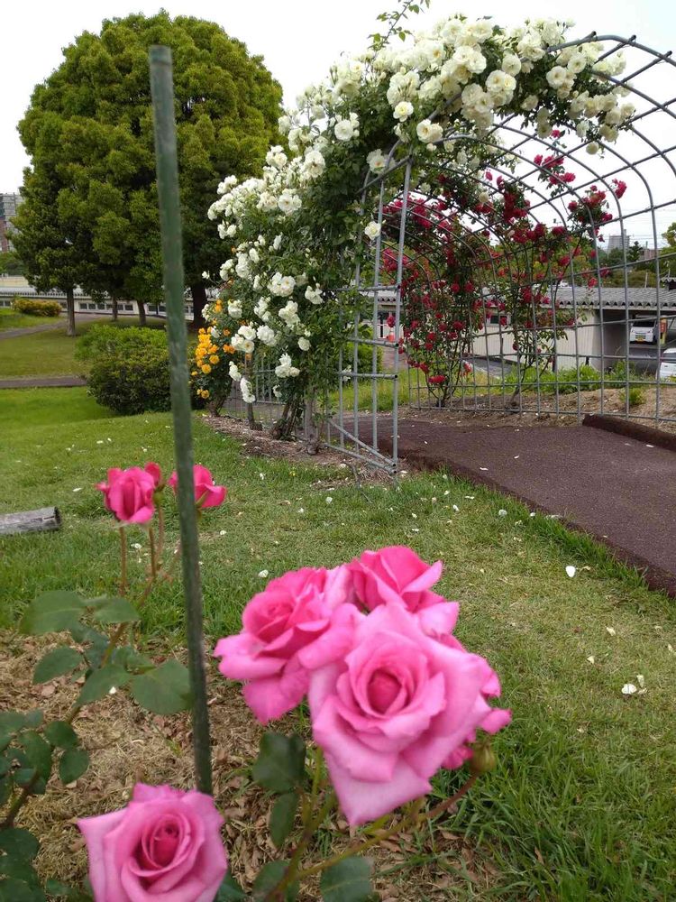 バラが見頃になっていました。トンネルには、赤と白のバラ、手前はピンク色❣可愛い❣