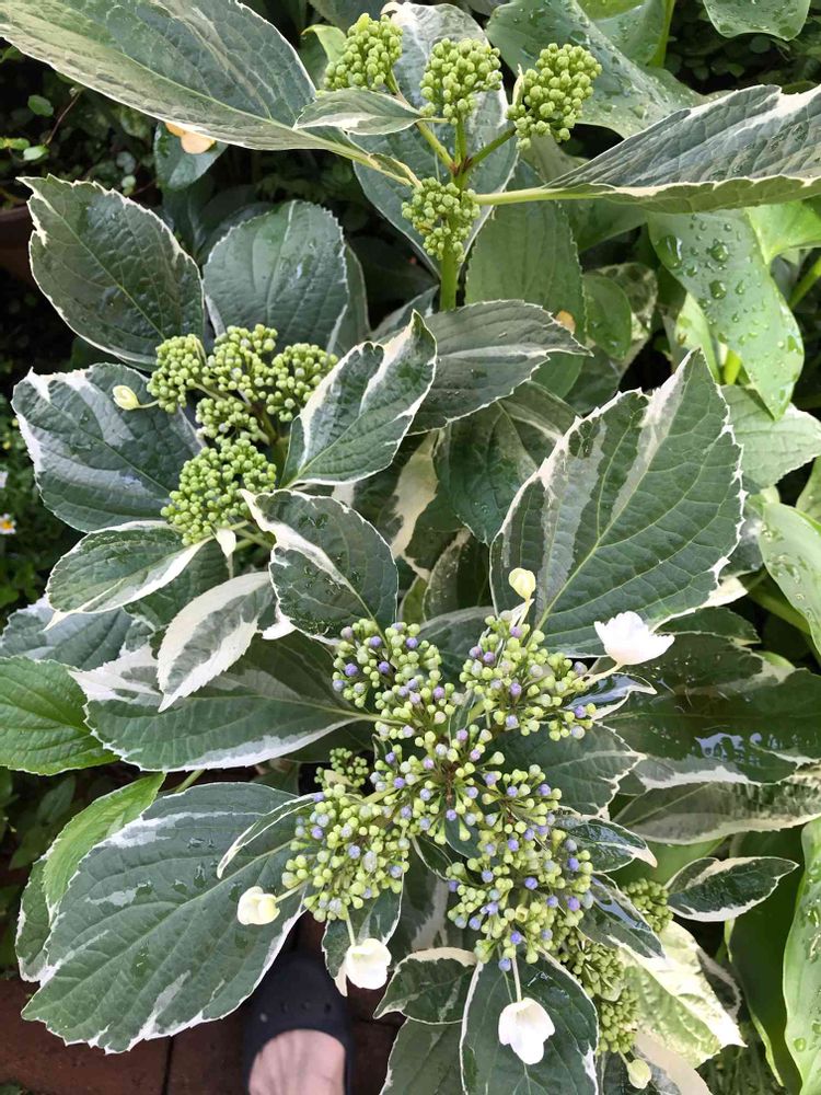 この斑入りのアジサイは去年、いただいて土に挿しておきました、だから まだ小さいのですが、こんなに花をつけていい子ですよね🌿
