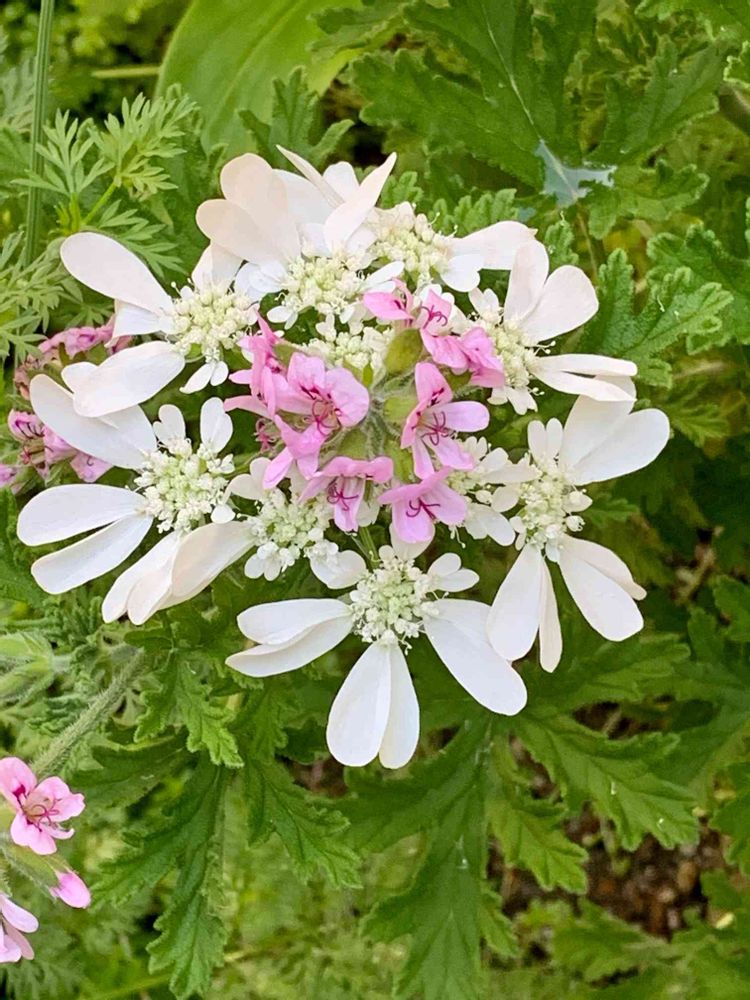 こんな可愛いお花があるのかと思っちゃった😄オルレアさんとローズゼラニウムさん、一体化してますね♪