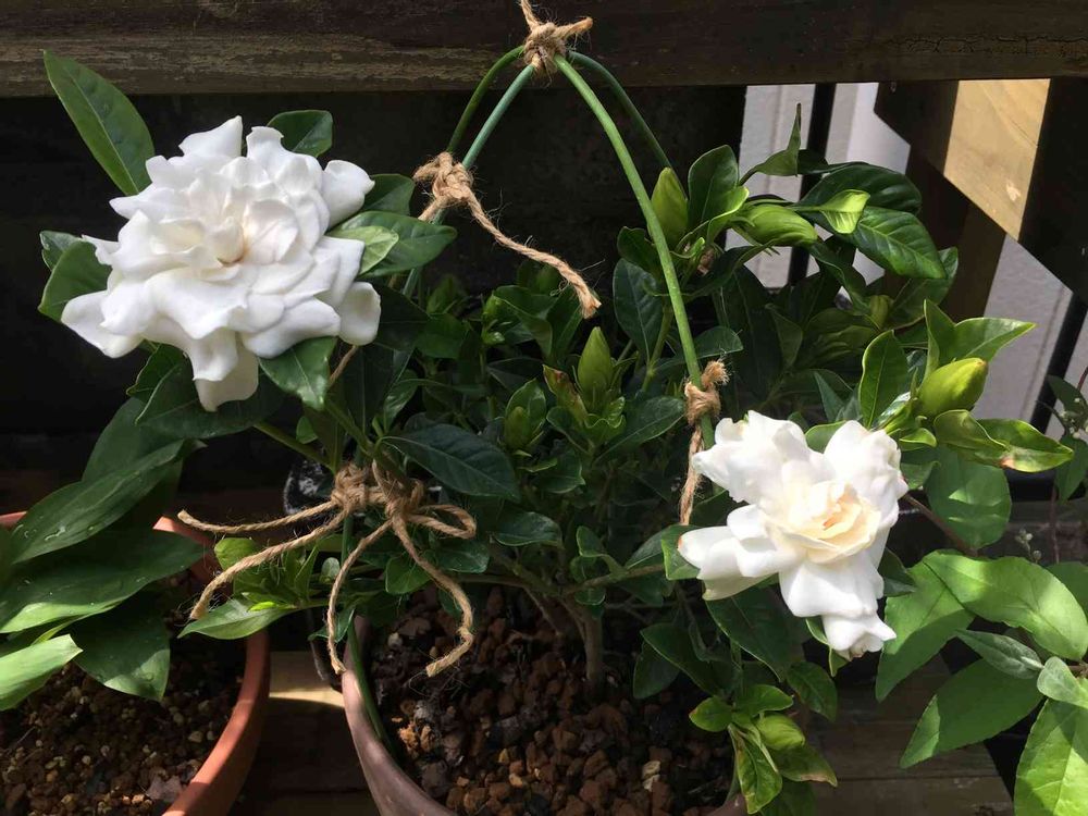 害虫の卵駆除の後は花の重みで枝が下がってるし、2本植わってるからこの先樹形整えるために枝の向き調整して固定〜♪