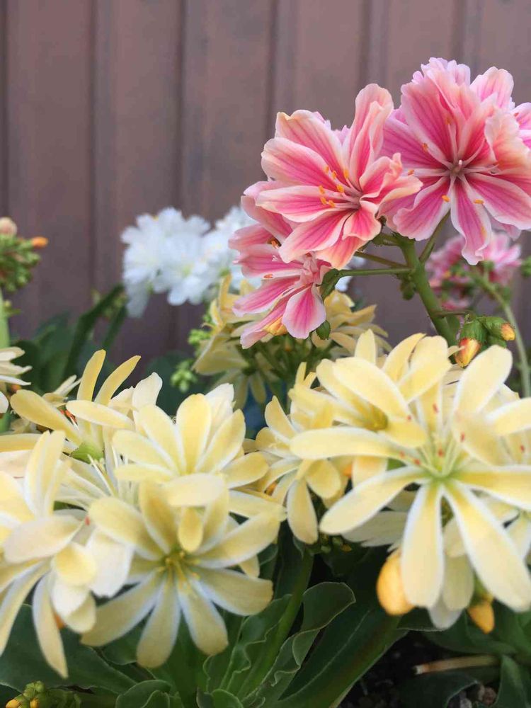 浅くて丸いプランターに6色7本植え(1つ枝分かれして8になってたけどw)のレウィシア♪