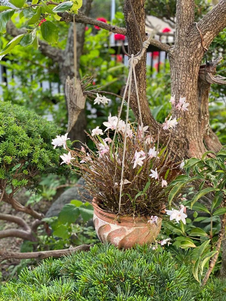奥にあるぶら下がっている小さなセッコクも気になります。木の鉢ですか❓