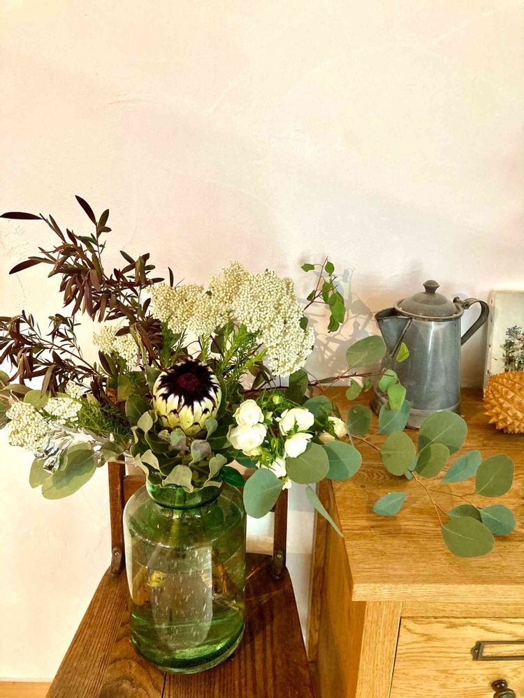 色合いがとにかく好き。庭のメラレウカとユーカリとテトラゴナ。職場で購入したスプレーバラとライスフラワーを合わせて。