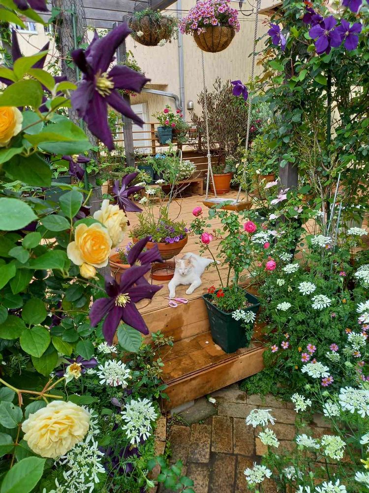なんて素敵な風景でしょう〜😍💕お花に囲まれて外猫ナナちゃが羨ましい〜🐈💖