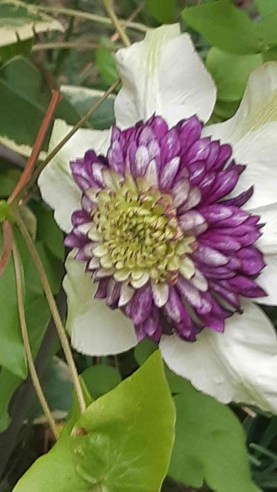外側の白い花びらが、クレマチス。その一種のテッセンだと思います。