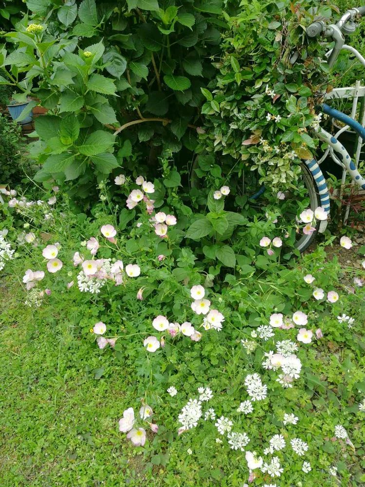 去年はこの場所はヤグルマギクとオルレアが競合していたはず。自転車置き場だからほっぽりっ放しで咲くもの勝ちなはず。なのに気がついたら昼咲き月見草が満開です。随分前に絶滅しちゃったと思っていたのに今まで息を潜めて暮らしていたのかなぁ、、、。今年の気候にマッチしたのか、他の植物を凌駕して今年のこの勢いは何なのだろう。