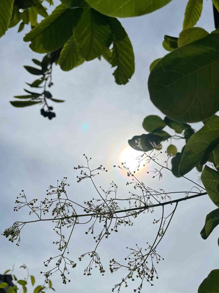 青空とまではいかないけれど、少し咲き始めたスモークツリーの蕾と、ビワの実のシルエット