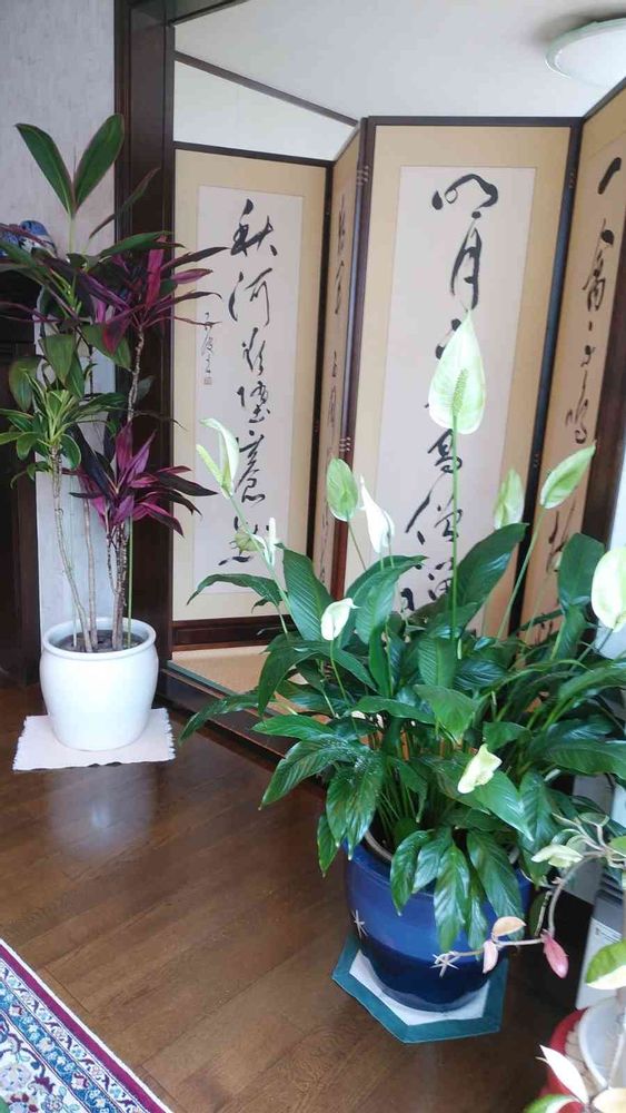 スパティフィラムの班入りに蕾が付いてますよ。私もドラセナアイチアカが好きで植えてます。
