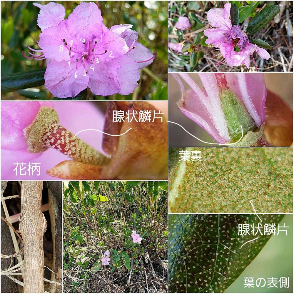 ツツジ属に含まれて、葉や子房などに腺状鱗片のつくものは、ゲンカイツツジ亜属とヒカケツツジ亜属のふたつの亜属がありますが、これらに含まれるもので東北に自生する種はありません。そうなると、植栽されたものかなのなー。