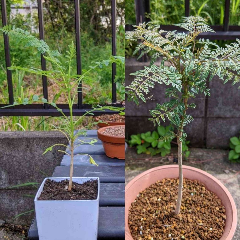 左は去年右は今年のジャカランダさん。太く大きくなりました。このこはおおきくするつもりなのてこのまま元気に育てます。