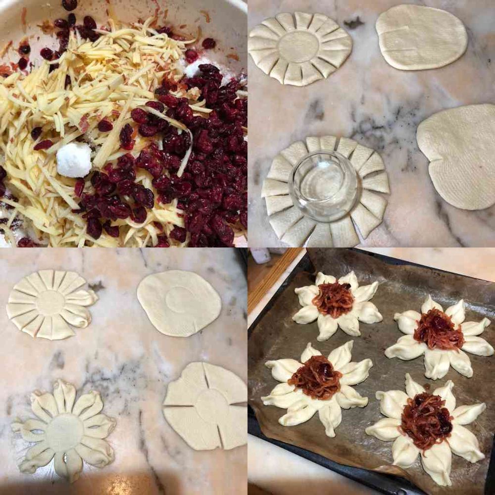 パン生地を花パンにして、中央にりんご、クランベリージャムを乗せた。