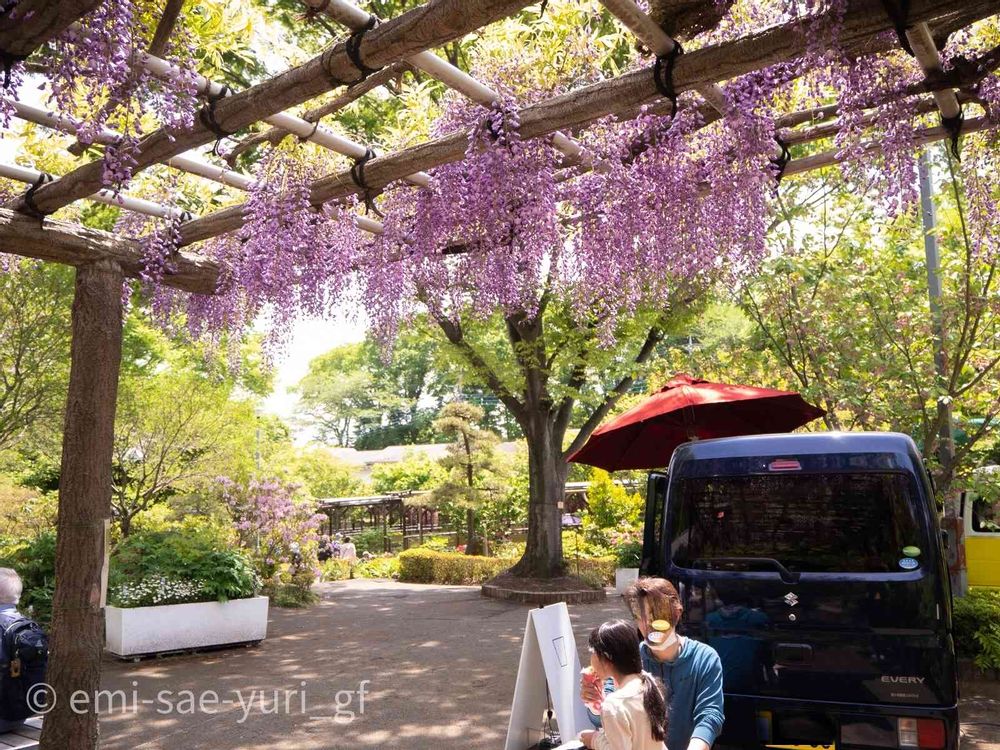 藤棚の下でソフトクリーム食べる親子