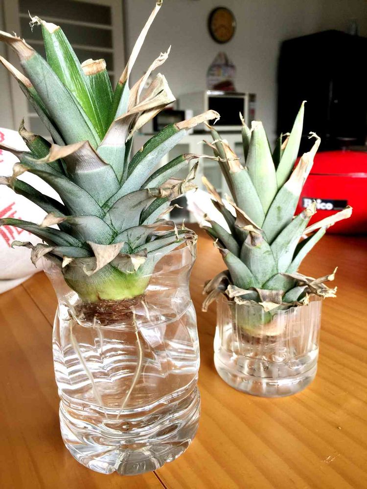 おはようございます😃 これはね 普通に売ってる パイナップルの頭(?) だよ‼️ パイナップル 水栽培で探すと やり方が 出てきます^_^