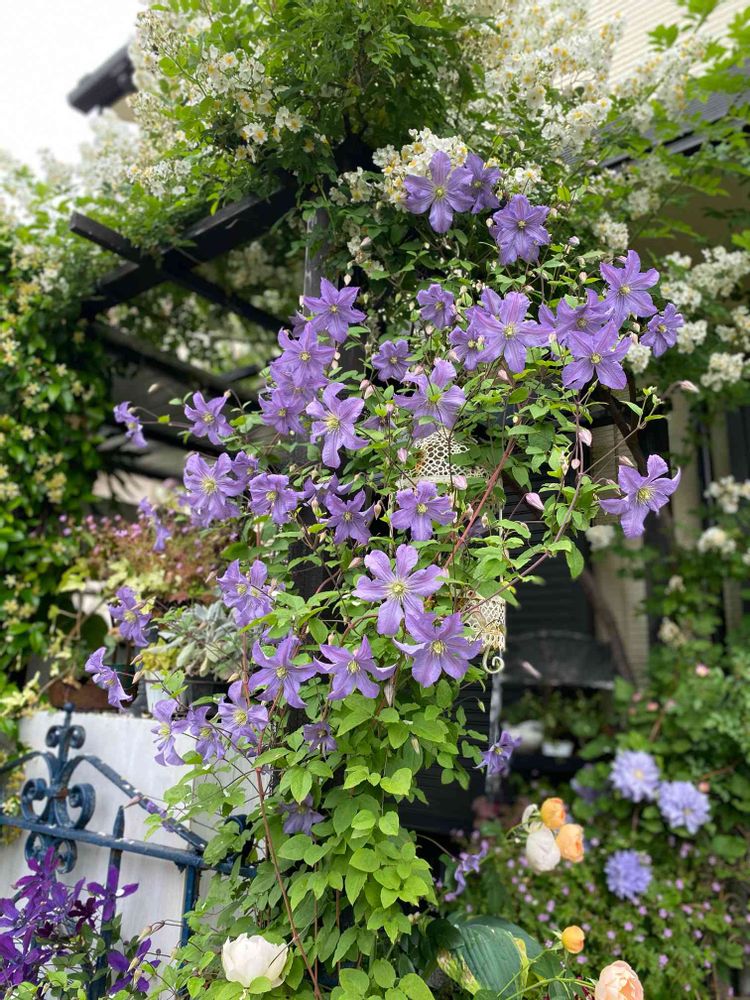 高さを活かしたクレマチスと白バラの組み合わせが素敵ですね😀✨