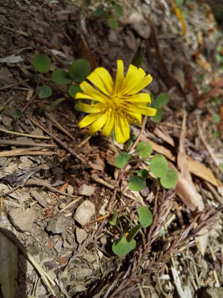 山道で会いました。ニガナに 似た花もありました。「イワニガナ」ですね🎵 この子は、散歩の時 たまに見かける「ジシバリ」なんですね! チョッと雰囲気が違ったので、別の子 かと思いました😅
