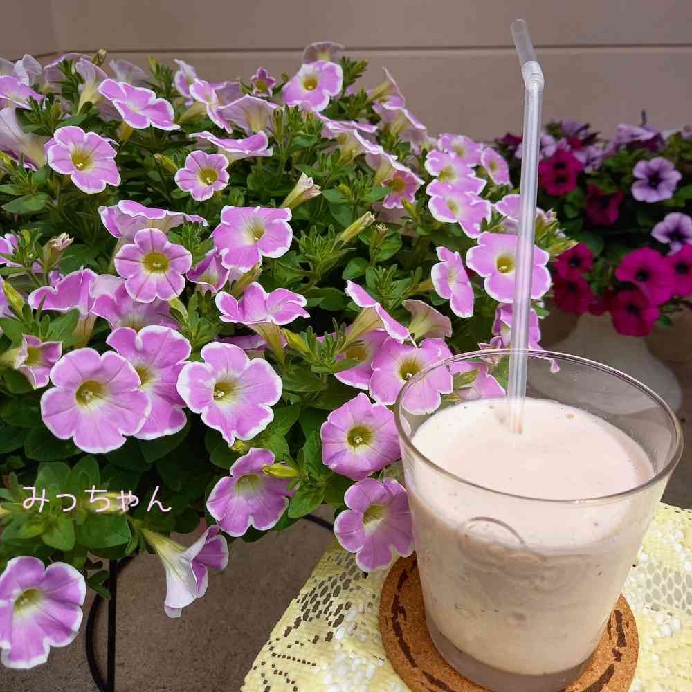 お花とのコラボで、自家製、いちごシェイク🍓🥤を